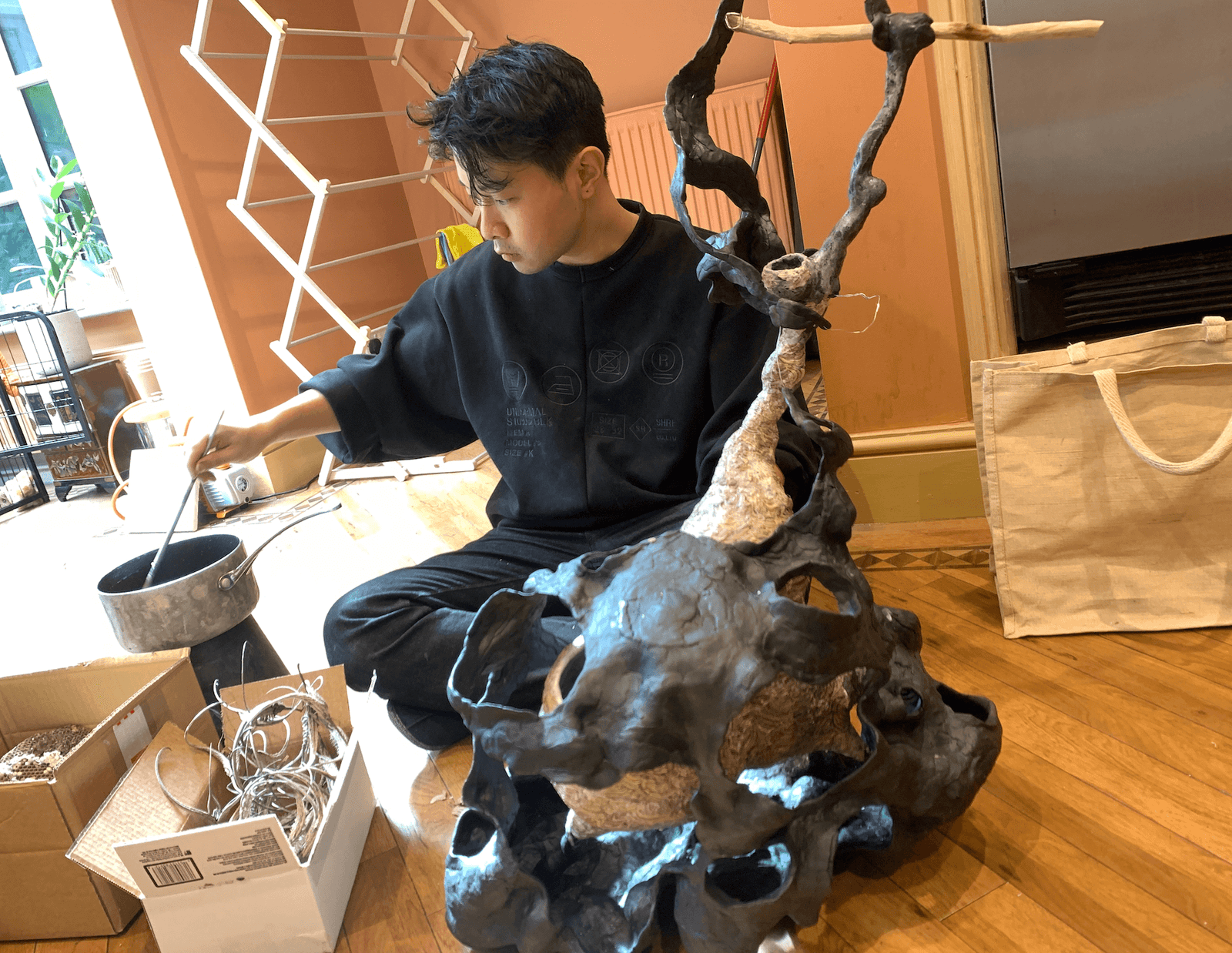 In this Emaho Magazine interview, Meng Zhou (RCA MA 2018) traces her journey from China to London, channeling meteorites, shells, and burnt wood into Il Trovatore's spatial memories and Star Chart's cosmic mapping. As "Keeper of the Fire," she probes ecology, myth, and time's erosions across Dust to Dust and Hero Game.