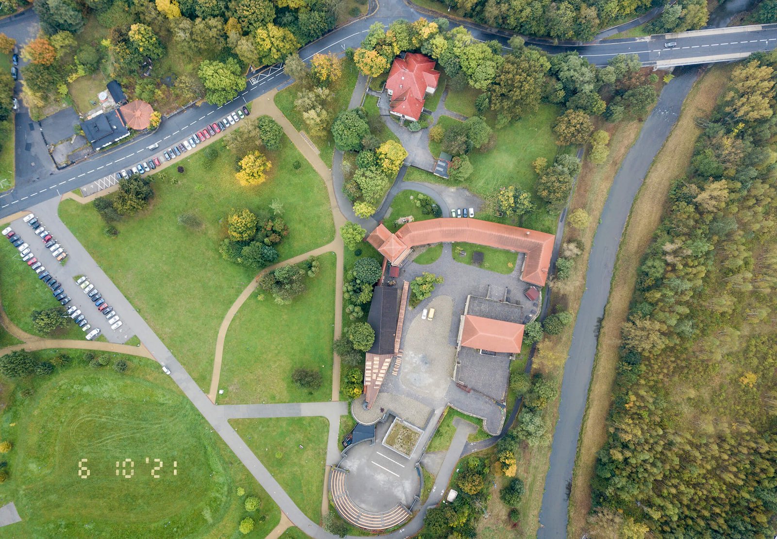Another more recent artwork is Marking the Day. This piece features a large-scale date, inspired by the small date stamps often found in the corners of old photographs. It was created by blocking sunlight with road plates, which prevented photosynthesis and temporarily turned the grass yellow. The date, 6 October 2021, marked the opening of Ostrava’s Cuckoo Festival.