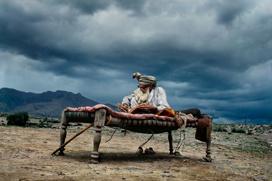 Afghanistan. April 1983. An old man sitting on a bench is reading Koran near the Pakistani border. He is a refugee fleeing the Soviet invasion with his family.